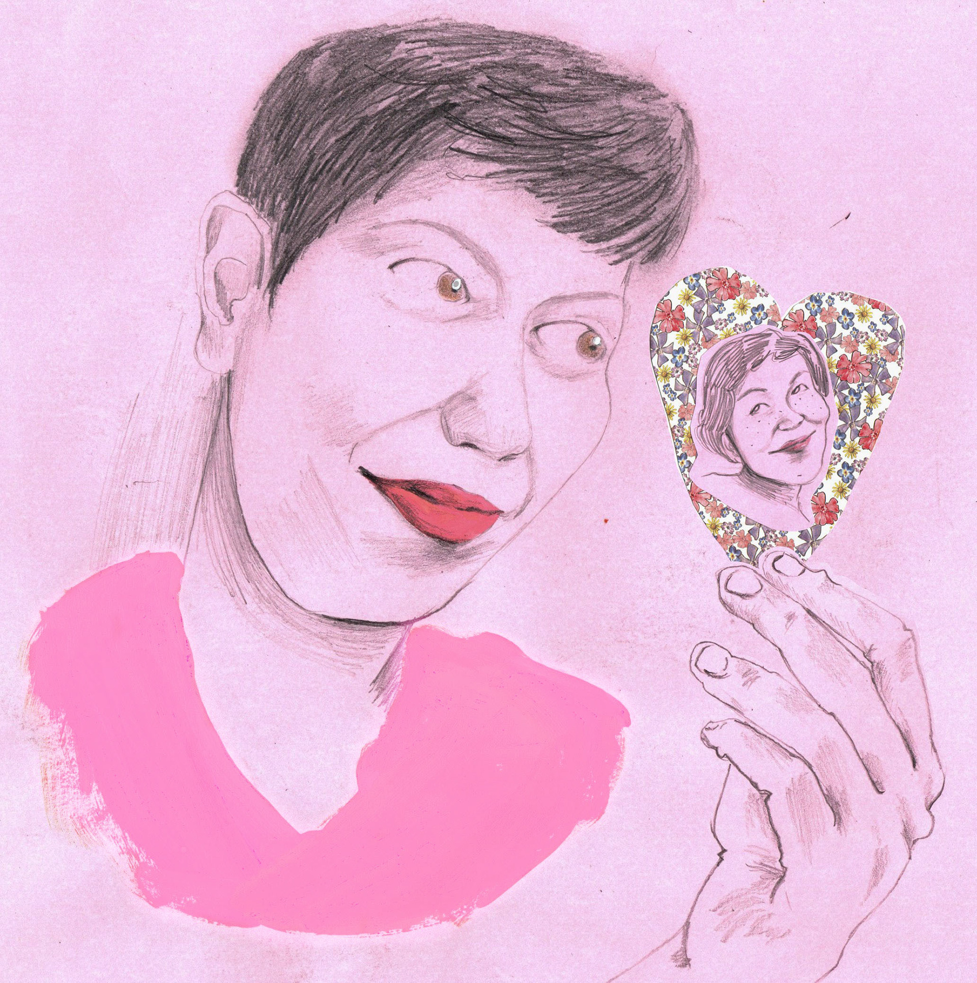Gouache paint, coloured pencil, graphitte pencil and collage on pink paper